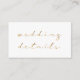 Una gran tarjeta de acompañamiento para la invitación de boda les da a tus invitados una visión general de tu gran día con texto con efecto dorado. Llena la tarjeta insertada con todos los detalles que tus amigos y familiares necesitan saber: fecha, ubicación, hora y cualquier otro requisito o restricción y añádela a tu invitación de boda. Estas tarjetas seguro harán una diferencia y harán las cosas mucho más fáciles en la planificación de tu gran día.