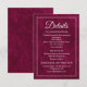 Share all the essential wedding information with this elegant details card, designed with a rich berry velvet-textured background and a refined double-border frame. Classic serif and script typography create a timeless, upscale look perfect for formal and modern weddings alike. Use this card to highlight accommodations, reception details, travel information, and important notes your guests need for the big day. A beautifully coordinated addition to any luxury wedding invitation suite.