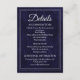 This elegant wedding details card features a rich navy blue textured background paired with refined white typography for a timeless, formal presentation. Designed to complement classic and black-tie wedding stationery suites, the layout clearly organizes accommodations, reception information, and additional details in a clean, easy-to-read format. A graceful script headline combined with traditional serif text creates a sophisticated balance, while the double-line border adds a polished finishing touch. Perfect for couples hosting formal, evening, or traditional weddings who want to share essential guest information in a coordinated and upscale style.