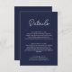 Esta elegante tarjeta de gabinete con detalles de boda azul marino es perfecta para un boda moderno. el diseño es sencillo, con una elegante caligrafía blanca sobre un fondo azul marino.