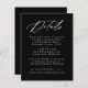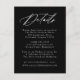 Nuestra elegante colección de bodas caligráficos presenta un hermoso guión de caligrafía blanca con un fondo negro. Personalice esta tarjeta boda con detalles importantes del boda como alojamiento en el hotel, página web del boda, organización de viajes, recepciones de bienvenida y más. La tarjeta de detalles en boda blanco y negro es perfecta para bodas formales e informales de cualquier temporada.