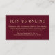 Elegante tarjeta roja burgundy para ofrecer una opción online para los invitados que no pueden asistir físicamente a su fiesta de graduación en persona debido a la distancia u otras circunstancias. "Únete a nosotros en línea" y los detalles virtuales en línea están en la moderna tipografía de oro ligero.