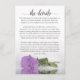Esta hermosa tarjeta de gabinete boda está diseñada para darle espacio adicional para cualquier información que sus huéspedes puedan necesitar, incluyendo sitio web, registro, recepción, viajes, alojamiento o cualquier otro detalle. La tarjeta presenta un diseño magnífico con un único rosa de color púrpura lila reflectante y un título de caligrafía de escritura de encaje que dice "los detalles". La parte posterior es de color morado claro o violeta.