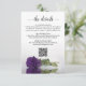 Esta bonita tarjeta de gabinete boda está diseñada para darle espacio adicional a cualquier información que sus huéspedes puedan necesitar, como registro, recepción, viajes, alojamiento, etc., así como un código QR personalizable que dirige a sus invitados a su sitio web para más información. La tarjeta presenta un diseño magnífico con un único rosa de color púrpura real profundo y un título de caligrafía de escritura de encaje que dice "los detalles".