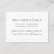 Esta sencilla y minimalista tarjeta de información del sitio web del boda incluye un tipo de letra serif clásico adornado con un toque de caligrafía con letras a mano y un fondo blanco y limpio. Personalice esta tarjeta de gabinete de detalles con la información del sitio web de su boda y cualquier otro detalle utilizando la plantilla de texto. Creado como parte de mi colección de bodas de Bretaña. Asegúrese de examinar los demás elementos de este conjunto para crear una sofisticada y coordinada búsqueda de la celebración de su boda y los eventos que lo rodean. Para añadir texto o cambiar el posicionamiento, cambiar fuentes o colores de fuente, o añadir gráficos, haga clic en "Personalizar" y "Editar usando la herramienta de diseño". Si necesita ayuda adicional para ajustar esta plantilla, aproveche el servicio gratuito de Zazzle en https://www.zazzle.com/live o póngase en contacto conmigo a través del sistema de mensajería de Zazzle. Por favor tenga en cuenta que yo creo los diseños, pero todos los trabajos de impresión y envío son realizados por Zazzle en sus instalaciones de producción, así que si hay algún problema con su pedido, por favor contacte con su servicio de atención al cliente al 1-888-892-9953 o https://www.zazzle.com/about/ask.
