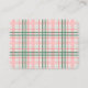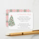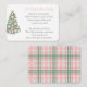 Este diseño de tarjeta de alojamiento para bebés cuenta con un elegante árbol de navidad acuático decorado en rosa y blanco. Estos elementos de acuarela fueron pintados a mano originalmente antes de ser escaneados en forma digital. En el reverso se observa un patrón blanco rosado y verde claro.