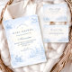 A classic powder-blue toile design inspired by traditional French countryside prints. Vintage nursery motifs — pram, rocking horse, lamb, pastoral village scenes and delicate ornamental borders — frame a clean, structured central layout. The soft ivory background paired with refined blue linework creates a timeless and sophisticated look. Perfect for a traditional baby shower with an elegant European aesthetic.