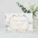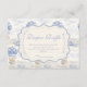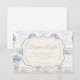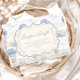 Un dulce diseño inspirado en época pasada que presenta delicados lazos azules, detalles de rayas suaves y encantadoras ilustraciones de jardín de arándanos. El arte de estilo Toile con adorables animales y cestas de frutas crea un ambiente clásico de libro de cuentos en una paleta de azul suave en polvo. El marco central ornamentado añade elegancia mientras mantiene el aspecto general ligero, refinado y atemporal. Perfecto para un baby shower con un suave tema de jardín y un toque de encanto tradicional.