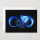 Luminous infinity symbol with glowing, beautiful, lushly blooming rose made of blue flames on black background.