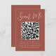 Facilite a los huéspedes la confirmación de su boda o evento con estas tarjetas RSVP nupciales modernas con código QR. Las elegantes tarjetas del recinto de bodas muestran "Scan Me" en un capricho blanco con un fondo rojizo. Personalice la tarjeta con su fecha RSVP, su sitio web de bodas e instrucciones para los huéspedes que utilicen las plantillas de texto proporcionadas. La parte posterior de la tarjeta proporciona espacio para texto y/o fotos adicionales. Diseñado para coordinar con nuestra colección de bodas de script simple.