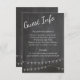 Tarjeta de información de invitado de pizarra con luces. Puede añadir todos los detalles de su boda en esta tarjeta. Puede cambiar los encabezados o quitar una sección. Si necesita más espacio en la parte delantera, puede retirar las luces en la parte delantera. O puedes subir un mapa del sitio del boda en la parte trasera. Esta tarjeta es excelente para todos tus detalles adicionales como el sitio web del boda, ropa, transporte, alojamiento, etc. La tarjeta coincide con otras de la colección de mi tienda.