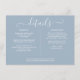 Una elegante tarjeta de información de detalles de boda personalizada con sus detalles especiales en tipografía elegante y sus nombres y fecha de boda al revés en un polvoriento fondo azul. Puede personalizar el fondo del color de su tema boda favorito. Diseñado por Thisisnotme©