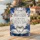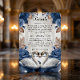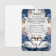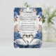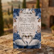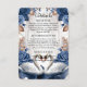 Mejore su suite de invitaciones formales con este inserto "Something Blue", que presenta cisnes románticos y flores vintage para una estética elegante y atemporal. Este diseño presenta una pareja de cisnes ilustrados que se enfrentan hacia adentro, simbolizando la devoción, enmarcados por un exuberante arreglo de flores de acuarela. La paleta de colores utiliza rosas de color azul profundo y polvoriento contrastadas con un cálido taupe y un follaje marrón terroso. Estos elementos están colocados sobre un fondo suave de color crema que simula visualmente el aspecto de pergamino o vitela envejecida. La tipografía combina un elegante guion de caligrafía formal para el encabezado con una fuente serif tradicional para el texto del cuerpo, lo que garantiza una alta legibilidad. Tenga en cuenta que esta es una imagen impresa plana con un efecto de textura de pergamino impreso; no contiene vitela real, relieve