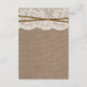 La rústica colección de bodas de herradura es un impresionante diseño con un bonito fondo rústico de burrega con un romántico efecto de encaje blanco vintage y dos herraduras entrelazadas en twine. Estas tarjetas de detalle se pueden personalizar para su ocasión especial y harían el perfecto inserto de correspondencia para una suite boda, ducha de novia, fiesta de compromiso, fiesta de cumpleaños y mucho más. Estas tarjetas se pueden utilizar para crear tarjetas de detalle, tarjetas de información de los huéspedes, tarjetas de alojamiento, tarjetas de dirección, registro de regalos o tarjetas de postre, así como tarjetas de ceremonia y recepción. Se pueden encontrar elementos bodas coincidentes en la colección.
