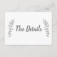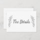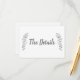 Comparte tus planes bodas con una elegancia reflexiva usando esta tarjeta de gabinete "The Details", que incluye un diseño de hoja dibujada con lápiz de textura suave. Con una estética mínima a mano, esta tarjeta es perfecta para parejas que planean un boda moderno, evocando un sutil sentido del amor por las plantas botánicas, manteniendo las cosas limpias, naturales y sin esfuerzo. Diseñada para complementar una amplia gama de temas, desde el encanto rústico del campo hasta las reuniones al aire libre bohemias, esta tarjeta de recinto combina con el encanto de los bodas primaverales y de verano. El elegante diseño proporciona espacio para los detalles mínimos de contacto, información RSVP, notas de alojamiento y más, actuando como un recordatorio de fecha boda refinado o inserción de coordinación junto a su invitación principal de bodas. Ya sea que estés acogiendo una estética de detalles minimalistas de boda o seleccionando una suite con elegantes respuestas de boda, esta tarjeta del recinto combina todo con una sofisticación silenciosa un toque encantador e intencional para guiar a los huéspedes hacia una celebración alegre y bien planeada.