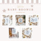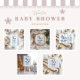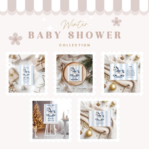 Este encantador diseño de una ducha de bebé se centra en un balancín acuático dulce. Este ilustracion, con un fondo azul a rayas suaves, evoca un ambiente clásico de vivero con un toque de invierno festivo, perfecto para celebrar la llegada de un pequeño.