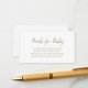 Tarjeta de compartimento de ducha para bebés neutra de género con un diseño simple con "Libros para el bebé" en un guión elegante / caligrafía junto con un mensaje pidiendo a sus invitados que traigan un libro en lugar de una tarjeta en tono dorado sobre un fondo blanco. Esta linda tarjeta es una gran manera de construir la biblioteca de bebés.