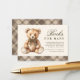 Agrega un toque de elegancia clásica a tu baby shower con esta tarjeta de inclusión de libros para bebé con osito de peluche de cuadros vintage. Con un cálido fondo crema y un borde de cuadros marrones con costuras doradas falsas en la parte inferior, este diseño combina hermosamente el estilo vintage atemporal con un encanto moderno.