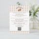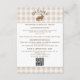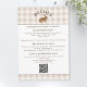 Tarjeta de inclusión de boda con fondo de gingham beige de Destei con un panel blanco bordeado en marrón en la parte superior e inferior para texto y código QR. En la parte superior, una ilustración caprichosa de una liebre en acuarela está centrada con un título personalizable curvo encima que puede leer "Detalles" o cualquier encabezado personalizado.