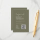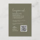 Esta moderna tarjeta de alojamiento de moda verde oliva boda en luna de miel es perfecta para un boda sencillo. El diseño de boho en madera presenta una tipografía bohemia rústica única y elegante con un color verde de bosque mínimo. Personalice esta tarjeta de gabinete de invitación con sus nombres, dirección web y un breve poema de poesía deseable. Incluya un código QR para que sus huéspedes puedan contribuir fácilmente a su registro de efectivo.