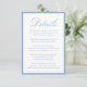 This wedding details card features “Details” in elegant light blue calligraphy, paired with classic serif typography for your accommodations, reception information, and wedding website. A light blue border frames the design with a crisp, airy finish that feels refined and timeless. The clean, structured layout offers a polished way to share important guest information while keeping your stationery look cohesive and elevated. Ideal for spring and summer weddings, coastal celebrations, and classic weddings, this insert card is easy to personalize with your event details.