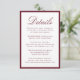 This wedding details card highlights “Details” in romantic burgundy calligraphy, paired with coordinating serif text for your reception, hotel accommodations, and wedding website information. The bold burgundy border adds warmth and richness to the design, creating a dramatic yet elegant look. Perfect for fall, winter, and formal evening weddings, this colorway offers a refined way to present important details with a touch of classic romance.