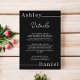 Esta elegante tarjeta de gabinete con detalles en boda blanco y negro es perfecta para un boda moderno. el diseño es sencillo y elegante, con una caligrafía blanca sobre un fondo negro.