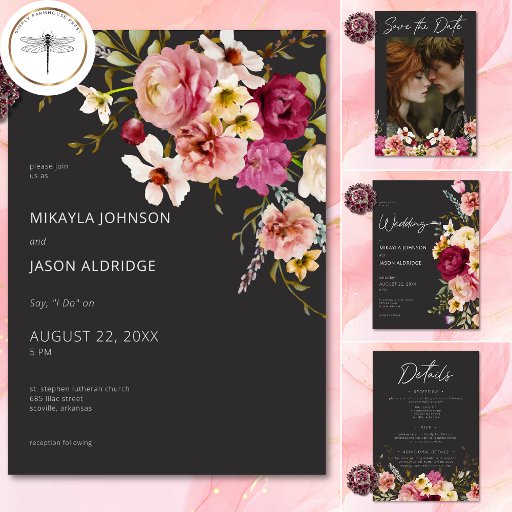 Modern Elegant Summer Meadow Floral Black WeddingDiseñado por Kathe Santillo
