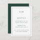 Tarjeta de gabinete simple Boda con un diseño moderno y elegante con su monograma de dos letras en la parte superior junto con la información de recepción rodeada de un borde delgado. Todos los elementos de diseño están en verde forestal y pueden cambiarse en la herramienta de edición de diseño. Una moda y un diseño de diseño, ideal para una pareja minimalista. Estas tarjetas son una adición perfecta a tu suite si tu recepción se realiza en un lugar diferente a tu ceremonia.