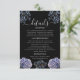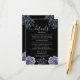 A bold and sophisticated Enclosure Card featuring dramatic dusty blue and grey floral illustrations against a stark black background. The crisp white typography and classic layout set an elegant, moody tone. Perfect for a formal evening or a sophisticated wedding.