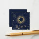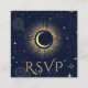 Tarjeta de gabinete de respuesta personalizada de boda de código QR mística celestial con galaxia vía lechosa cielo de medianoche con polvo estrella, luna creciente y otros símbolos astrológicos en colores azul marino y dorado. Esta tarjeta es fácilmente editable. Si necesitas ayuda para personalizar esta tarjeta o necesitas más productos para esta colección, por favor envíame un mensaje a través de Zazzle.
