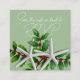 Gabinete de tarjetas de respuesta de fiesta o boda de Navidades climáticos cálidos con plantilla de código QR. Las pequeñas tarjetas cuadradas son de pino claro verde con escritura blanca y pez estrella con diseño holly. El texto pide a los clientes que escaneen el código para responder. El código QR se carga en la parte posterior de la tarjeta.
