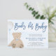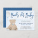 Cute osito de peluche baby ducha libros para tarjeta de inserción de bebé. Un oso de peluche marrón dulce sentado con un globo sobre un fondo de color azul claro.