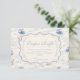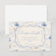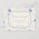 Un dulce diseño inspirado en época antigua que presenta delicados lazos azules, detalles de rayas suaves y encantadoras ilustraciones de jardín de arándanos. Arte estilo toile con adorables animales y cestas de frutas crea una sensación clásica de cuento de hadas en una paleta de azul suave en polvo. El marco central ornamentado añade elegancia mientras mantiene la apariencia general ligera, refinada y atemporal. Perfecto para un baby shower con un suave tema de jardín y un toque de encanto tradicional.