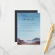 Esta tarjeta de inclusión para bodas presenta un paisaje sereno de acuarela con montañas en capas en azules y púrpuras suaves, contrastadas por colinas cálidas de color marrón rojizo. El cielo pasa de un azul claro a uno profundo, creando una atmósfera tranquila. La tipografía cursiva elegante destaca "los detalles", mientras que el texto simple sans-serif proporciona información adicional. El estilo semi-realista del diseño evoca relajación y anticipación, lo que lo hace perfecto para compartir los detalles específicos del evento de la boda.