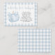 Añade un toque encantador a tu celebración de otoño con nuestra tarjeta de presentación para bebés. Perfecto para una ducha de bebé en otoño, este adorno anima a los huéspedes a traer un libro querido en lugar de una tarjeta, una manera cuidadosa de empezar la primera biblioteca del bebé. Con una adorable calabaza azul adornada con una proa delicada y un suave acento de gingham, esta tarjeta complementa cualquier ducha de bebé con calabaza o ducha de bebé con tema de otoño. Ya sea que esté escondido dentro de las invitaciones o que se muestre en su evento, es la manera perfecta de combinar el estilo estacional con un mensaje sincero. Destacados: Diseño de calabaza inspirado en la caída con detalles azules y de gingham Ideal para duchas de bebé y celebraciones de otoño. Suavemente anima a regalar libros en lugar de tarjetas Impresión de alta calidad; fácil de incluir con invitaciones. ¡Haga que su ducha de bebé de otoño sea aún más memorable con este toque dulce de temporada!