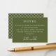 El diseño de pesca perfecto y sencillo para la pareja que se encarga de la pesca. Si buscas una boda con temática de pesca, moderna y elegante, no te pierdas el tiempo. Este diseño pesquero incluye un señuelo rústico de pesca verde musgo con anillos de boda enganchados al anzuelo de la pesca. Voltea hacia atrás para ver un patrón divertido de redes de peces para completar la apariencia de pesca. Termina tu paquete de invitación de boda con inserciones coincidentes. Consulta nuestra colección para completar tus invitaciones a bodas de pesca. Mostrar en la lista: Tarjeta de cierre del hotel
