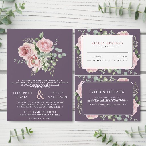 Blush Pink Floral Eucalyptus Dusty Purple WeddingDiseñado por Shabbir D