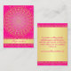 Esta exótica tarjeta de información sobre el recinto de bodas rosados y dorados tiene un gran patrón de medallón de círculo central de oro con corazones girados ornamentales que le detallan con estrellas de oro y puntos que se encuentran encima de un fondo de fucsia con otra capa de finos remolinos esmaltados y rociados en espliego brillante. También hay una banda de tono dorado en la parte inferior de la tarjeta que tiene texto de personalizable. Utilícelo como tarjeta de información, sitio web del boda o tarjeta de registro de regalos, etiqueta de regalo de favores matrimoniales, una tarjeta de pozo o caridad de deseos, o una tarjeta de direcciones o alojamiento. ****TENGA EN CUENTA que ninguno de los elementos de esta tarjeta se ha levantado o se ha grabado en relieve. Todo está impreso de forma plana. Esta tarjeta sería insertada perfecta en tu primavera, verano, otoño o invierno, bodas indios, hindúes o musulmanes o invitaciones a la ceremonia de compromiso. TENGA EN CUENTA que si cambia las fuentes, o el tamaño del tipo de letra, parte del texto puede ser cortado. Todo se imprimirá como lo ves en tu monitor. No veré tu tarjeta y Zazzle NO corregirá nada (tipografía, alineación, etc.). El texto y el tipo de papel son personalizables. Si necesitas ayuda con esta tarjeta, por favor envíame un correo electrónico ANTES de realizar tu pedido. Si necesita cualquier otro elemento coincidente, o le gustaría que le agregaran otros elementos de diseño, como Ganesh, o un símbolo, etc., por favor envíe su solicitud a niteowlstudio@gmail.com.