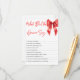 Agrega risa y diversión a la fiesta de despedida de soltera con esta tarjeta de juego “¿Qué dijo el novio?” con un diseño elegante de lazo rojo. Los invitados intentan adivinar las respuestas del novio a preguntas divertidas y dulces sobre la futura novia, lo que hace que sea un rompehielos perfecto y un recuerdo. Elegante y moderno, esta tarjeta es fácil de personalizar y combina perfectamente con un tema de fiesta de despedida de soltera con lazo rojo.
