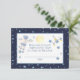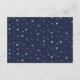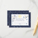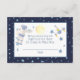 El pañal del espacio exterior rifa con estrellas azules en fondo azul de medianoche. Cada tarjeta tiene un hombre espacial, una nave espacial y una luna amarilla pálida sobre fondo blanco. Adjunte el sobre con invitaciones coincidentes.