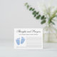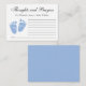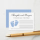 Tarjeta de servicio conmemorativo para niños para que los asistentes escriban una nota de simpatía a los padres y oraciones por el bebé, que incluye "Pensamiento y oraciones" en un elegante guión formal, los nombres de los padres y el bebé en la típica tipografía serif y una acuarela azul pastel de pies de bebé.