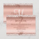 Adjunte esta elegante tarjeta de recepción nupcial con su Rosa Purpurina Gold Metallic Invitaciones a bodas en monograma para dar a sus huéspedes información sobre la ubicación y hora de la recepción. El damasco Rosa purpurina de oro en la parte superior e inferior se acentúa con anillos bodas, y enmarca la tipografía de escritura a la moda. El monograma de la novia y el novio está en la parte trasera de un elegante guión limpio. **No hay oro rosa, tinta metálica o purpurina real en este artículo. Se simularán los detalles de oro y purpurina rosa.