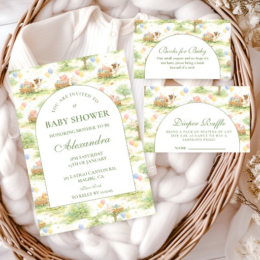 Celebrate in a charming countryside setting with this soft pastel farm-themed design, featuring adorable animals, delicate florals, and whimsical balloon details. The elegant arched frame keeps the layout clean and refined, while the illustrated farm scene adds warmth and personality without feeling overly childish. Perfect for a sweet, nature-inspired celebration that blends rustic charm with a light, modern aesthetic.