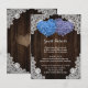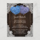 Provide your guests with important details with this rustic purple and blue floral wedding enclosure card featuring blue and purple hydrangea flowers on a barn wood background adorned with white floral lace. Two burlap hearts at the back.