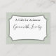 Si estás hospedando una ducha sin regalo para una futura novia, esta carta simple podría ser la elección para ti. Usando un tipo de letra de escritura a mano, primero añadí un encabezado que dice "Display Shower" en la parte delantera, y "Given with love from:" en el lado de la etiqueta de regalo. Se ha creado un campo de plantilla para ofrecer instrucciones a los clientes que no cumplan con su regalo; por favor, no dude en cambiar la redacción si fuera necesario. Todos los tipos de letra y colores se pueden modificar según se considere oportuno. Esta pieza tiene un fondo verde claro y sabio.