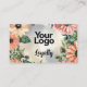 Deléitese con su elegante tarjeta de fidelización floral, con un fondo de acuarela sereno en azul y gris-amarillo suave. Una delicada corona de vegetación, rosas rosas y maricas de melocotón rodea la palabra "lealtad" en un elegante tipo de letra de diseño. La parte delantera también incluye espacio para tu logotipo. En la parte de atrás, añada tu oferta de recompensa personalizado, seis círculos de punzonado o estampado, e información de contacto. Ideal para boutiques, floristas o empresas de spa que quieran un toque suave y femenino.