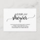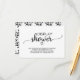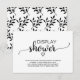 Esta tarjeta de ducha de exhibición de caligrafía negra simple es perfecta para una ducha de novia o una ducha de bebé con tema rústico o moderno. El diseño minimalista presenta una fuente de pincel elegante y un corazón femenino encantador. La parte posterior presenta un patrón clásico de hoja y ramas.
