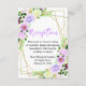 This fun and whimsical wedding reception enclosure card features watercolor purple flowers and foliage on a gold geometric frame. The text combines handwritten script and serif fonts for a stylish and modern look. This is perfect for a spring or summer rustic wedding.