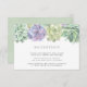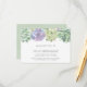 Tarjeta para la recepción de bodas botánicas con un borde superior compuesto por suculentos color agua verde y púrpura y sus detalles en un suave tipo de letra gris. En la parte trasera hay un lavabo de acuarela verde. Los suculentos añaden un gran elemento natural al diseño. Si la recepción se celebra en un lugar distinto al de la ceremonia, estas tarjetas de la caja son una buena manera de proporcionar información sobre la recepción, como la dirección, hora y vestimenta. Estas tarjetas son perfectas para un boda del desierto en primavera o verano.